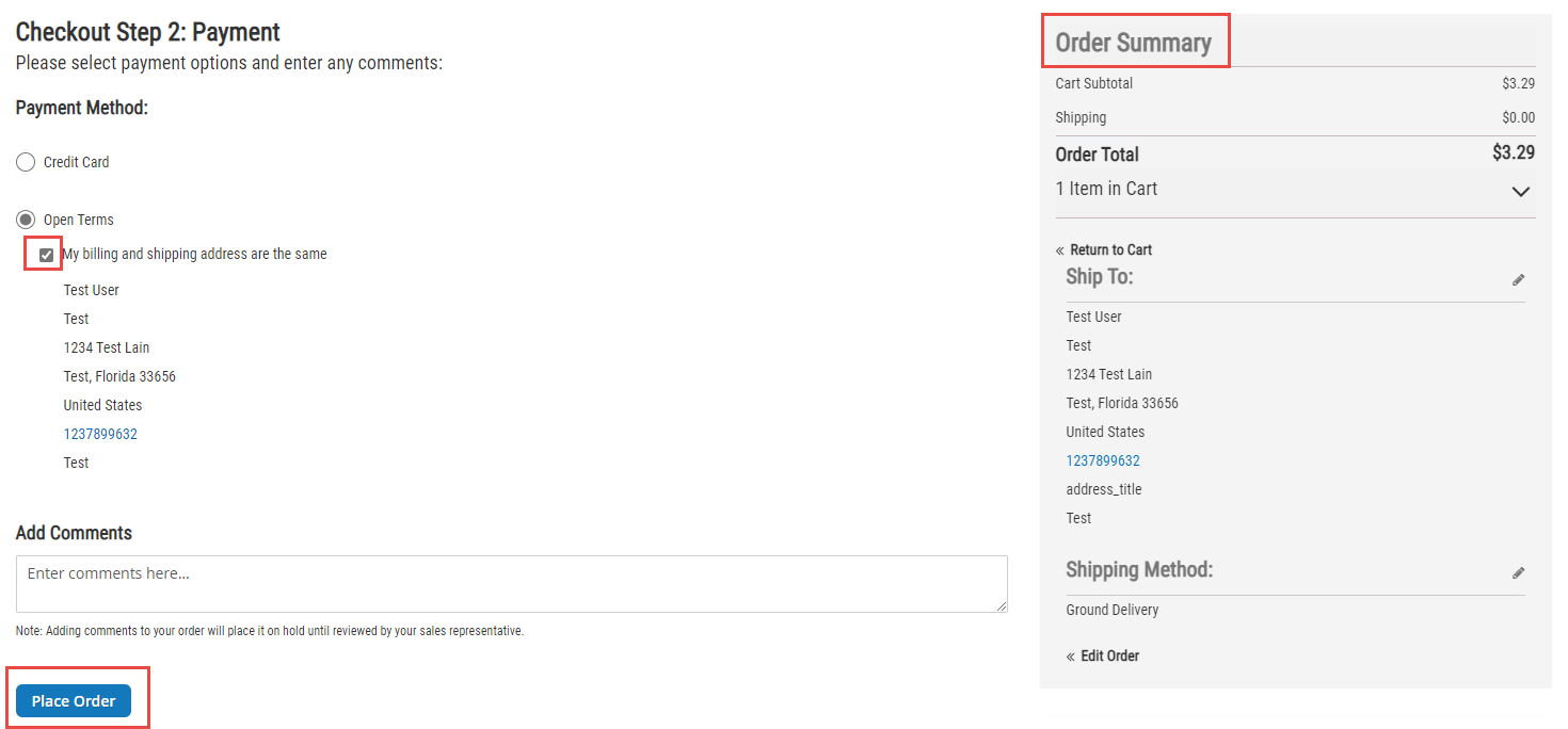 In step 2 of checkout, you will see all of your available payment methods, which can include credit cards or open terms. Select the payment method you wish to use.