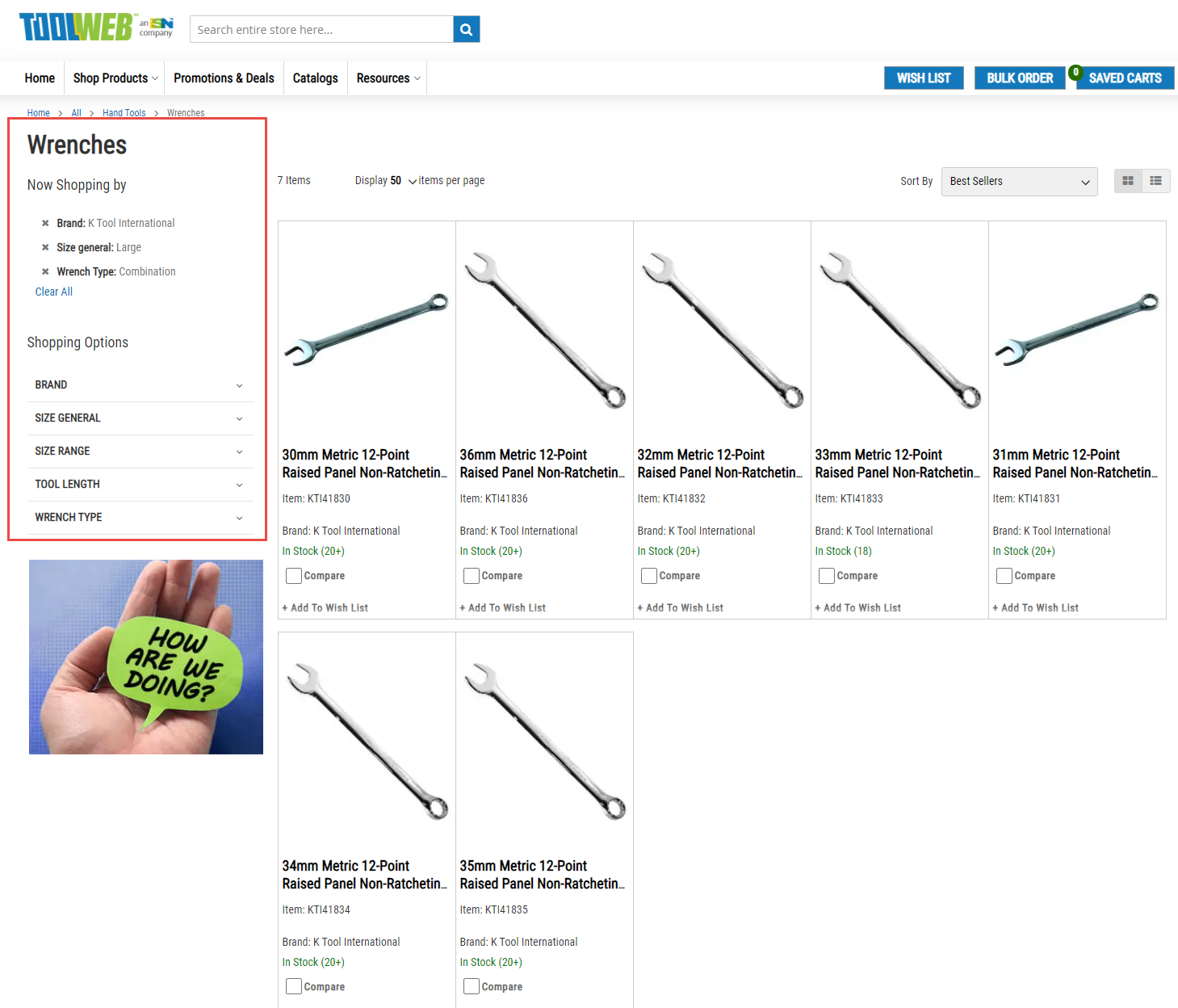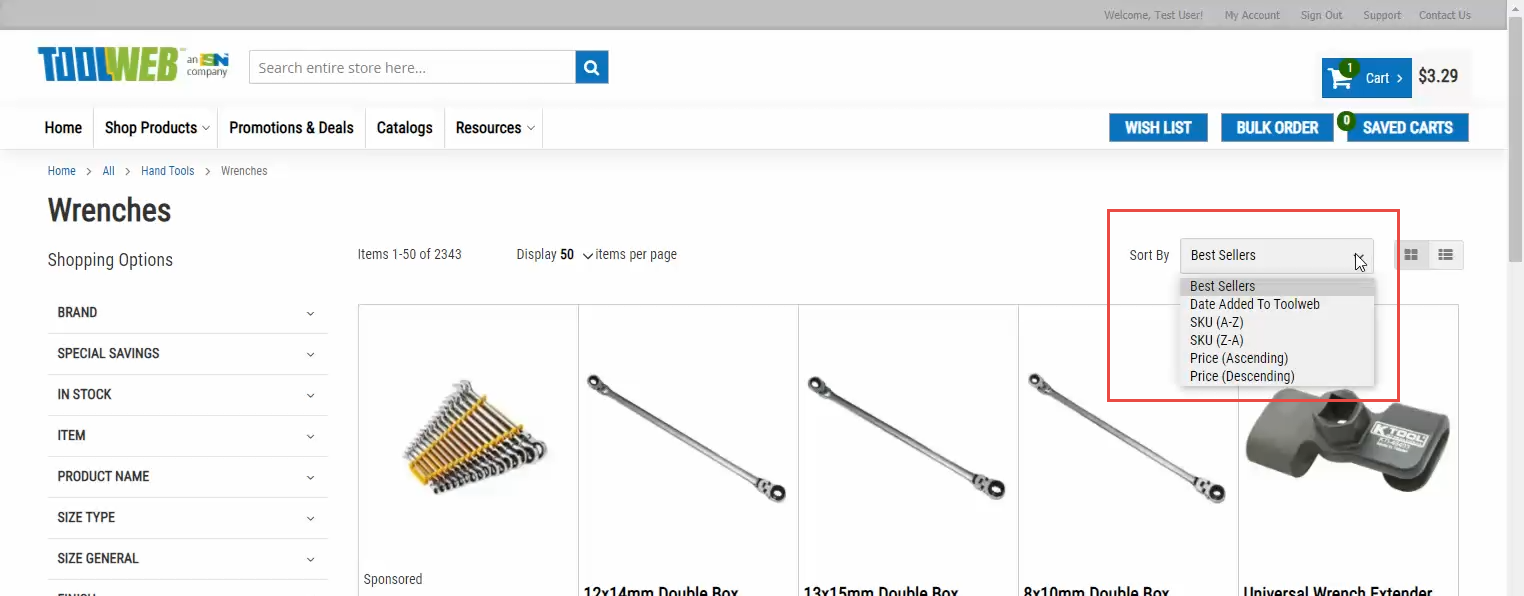The “sort by” drop-down allows you to further sort the search results by best sellers, date added to toolweb, SKU (A-Z), SKU (Z-A), price (ascending), and price (descending). Combining filters and sort options will help narrow down results greatly.