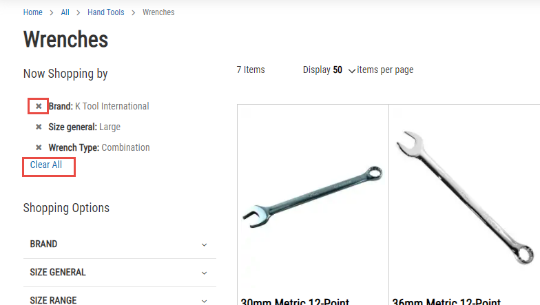 For example, the search for Wrench has more than 2000 Items. Filtering by brand, size general, and branch type I am able to narrow the results to 7 items.